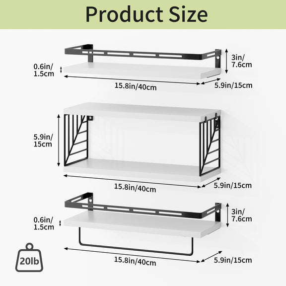 Our product is designed to meet all your decorative and organizational needs. The shelves feature sturdy metal frames that securely hold and protect bottles and collectibles. Additionally, a towel rack can be easily installed anywhere you desire, including directly on the wall. These versatile floating shelves are perfect for enhancing the aesthetic appeal and functionality of your kitchen, bathroom, living room, bedroom, and more.