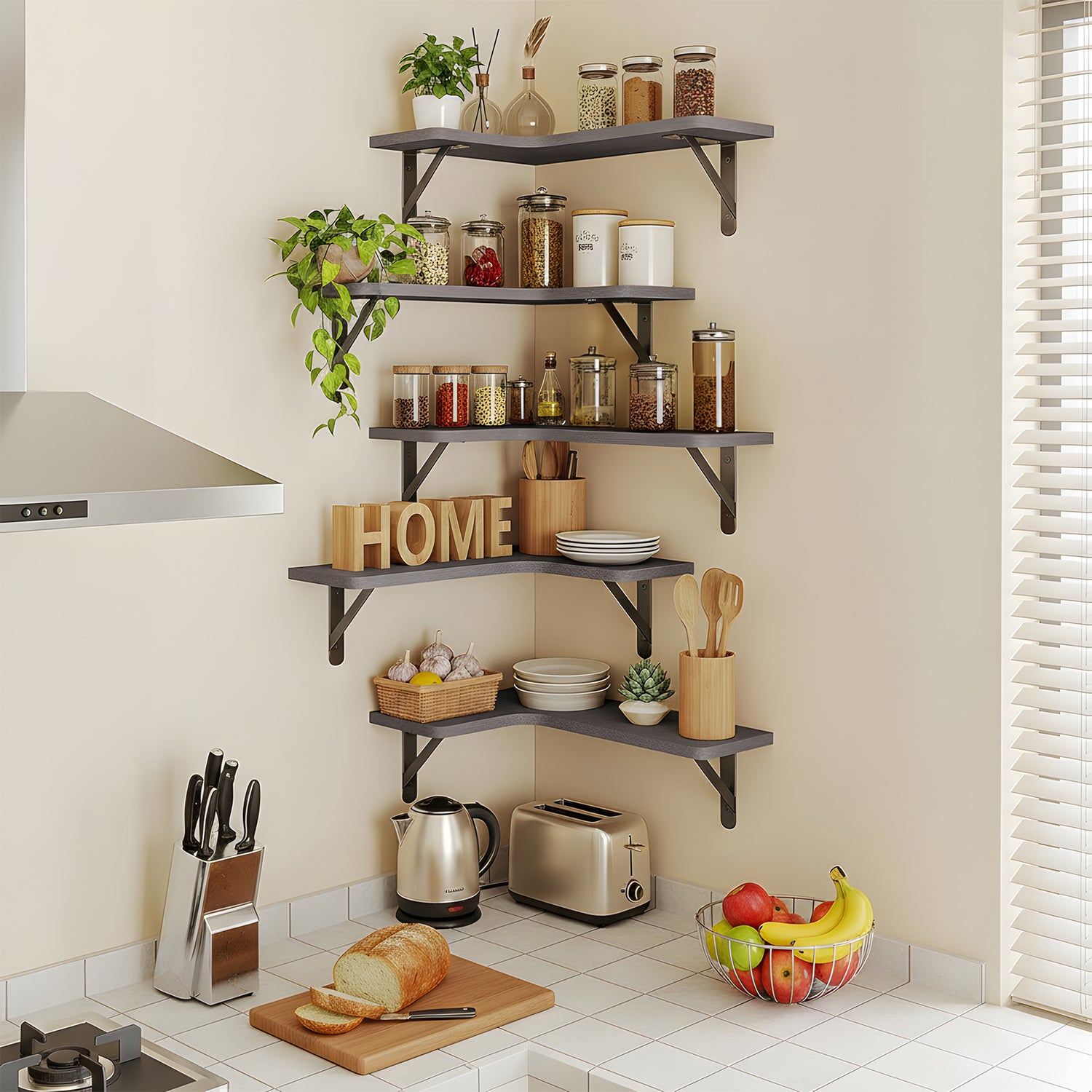 SUPERLELE 5-Pieces Floating Shelves for Wall, Rustic Wood Wall Mounted Corner Shelf Gray