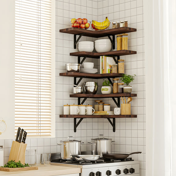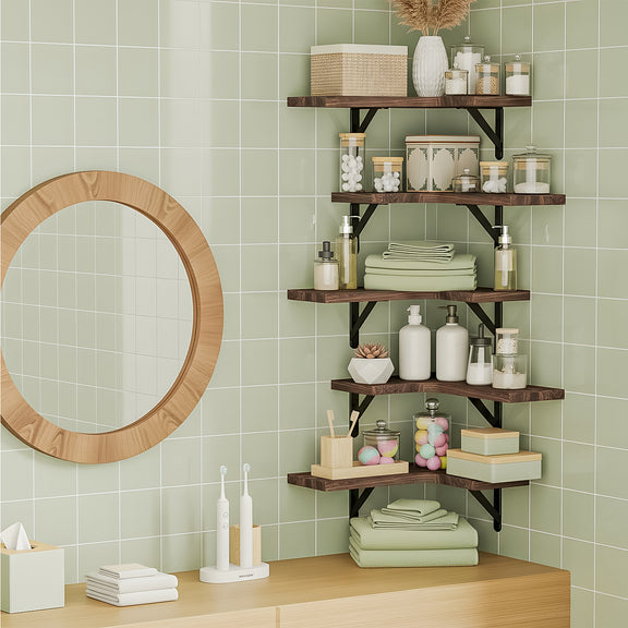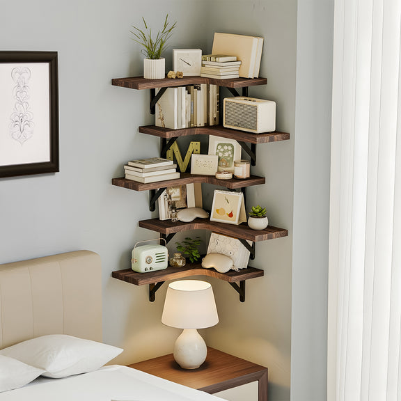 SUPERLELE 5-Pieces Floating Shelves for Wall, Rustic Wood Wall Mounted Corner Shelf Walnut Brown