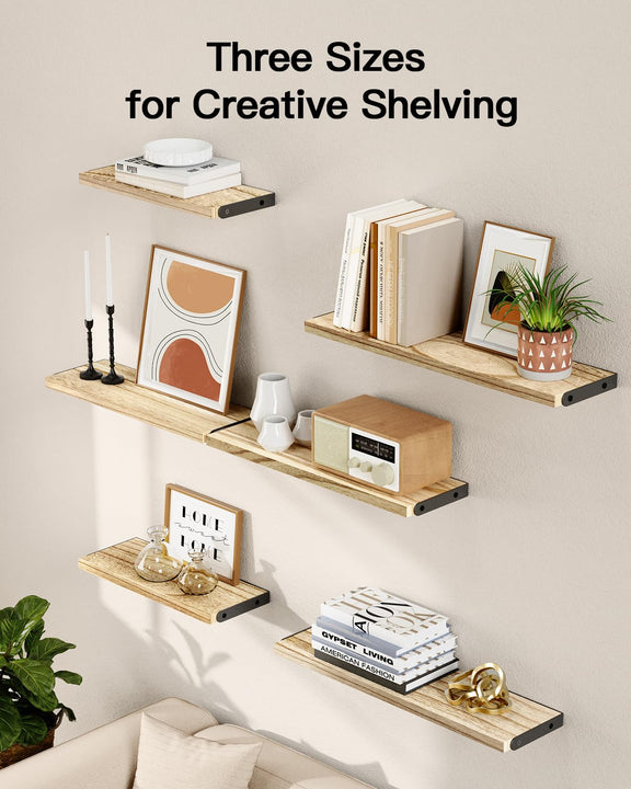 [Versatile Wall Shelf Set] Enhance your living space with this set of six solid wood wall shelves. Includes two large, two medium, and two small floating shelves for flexible & creative arrangement.